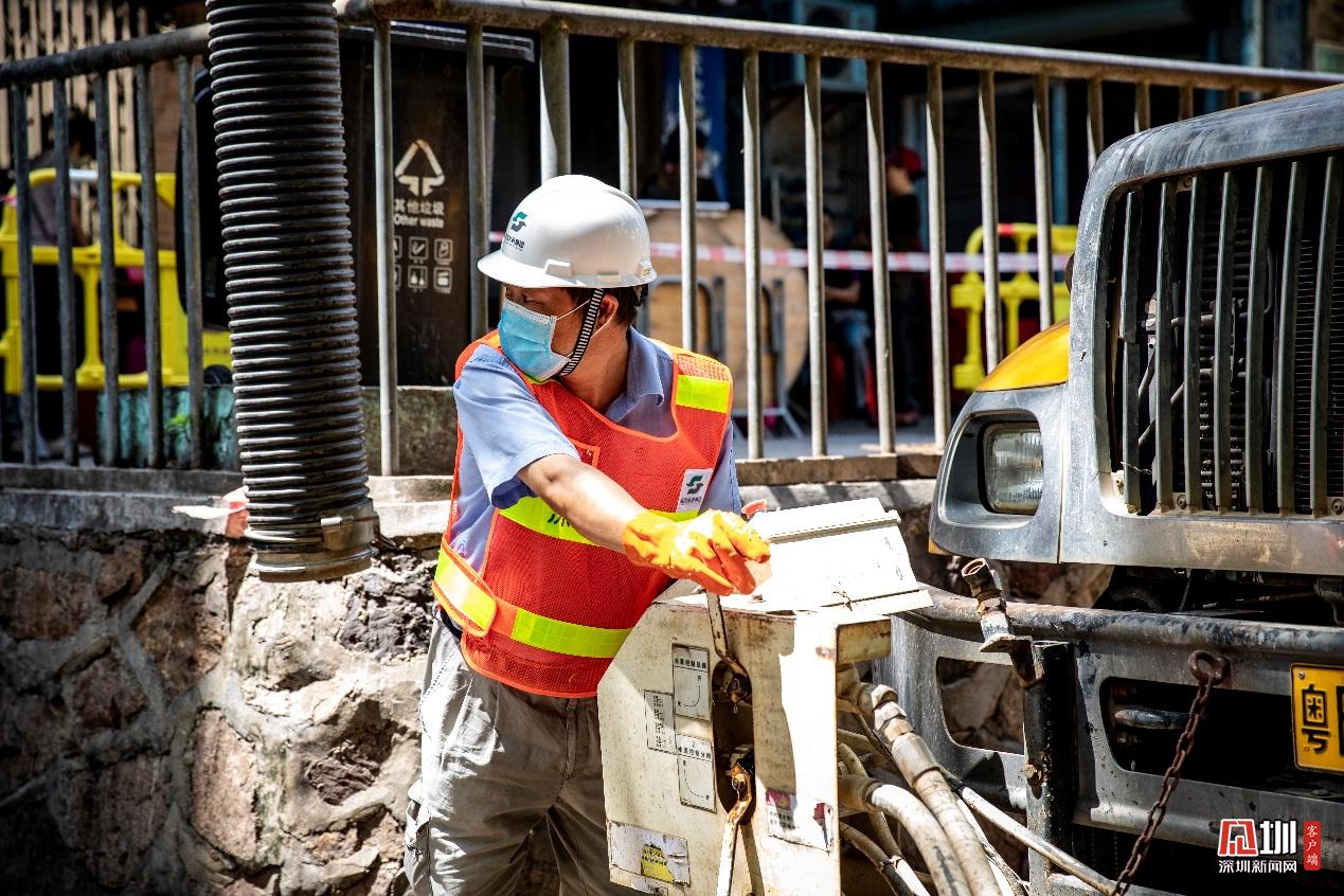 南山分公司清疏隊(duì)隊(duì)員方衛(wèi)星,正回頭專(zhuān)注地等待著指令,以及時(shí)啟動(dòng)抽水機(jī)。