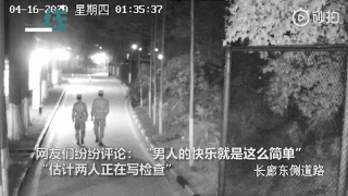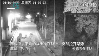兩位凌晨下哨的戰(zhàn)士走在路上,突然間拉開架勢,準(zhǔn)備“打斗”。劍拔弩張之際,突然畫風(fēng)一轉(zhuǎn),兩人做起了互相加油打氣的動(dòng)作。