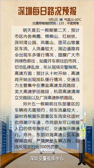 為了能度過(guò)一個(gè)不堵路也不堵心的假期,深圳交警建議大家錯(cuò)峰出行,深圳交警將密切監(jiān)測(cè)路面情況,市民在出行前可通過(guò)深圳交警微信、微博、交通廣播沿途交通誘導(dǎo)指示屏等方式獲取實(shí)時(shí)交通路況信息,合理規(guī)劃出行路線和時(shí)間,確保行車暢順。