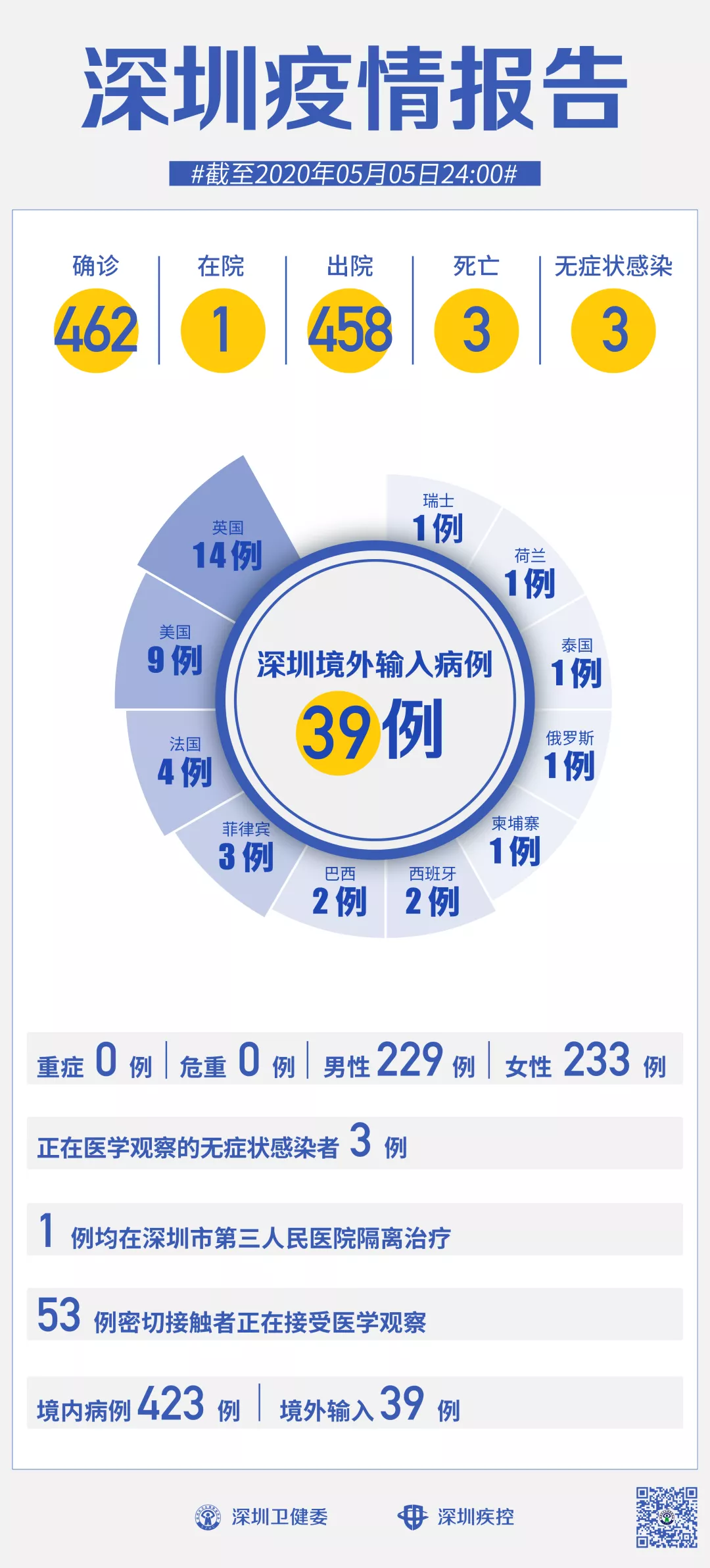截至5月5日24時,深圳累計報告新冠肺炎病例462例。5月5日當(dāng)天新增出院1例。