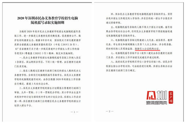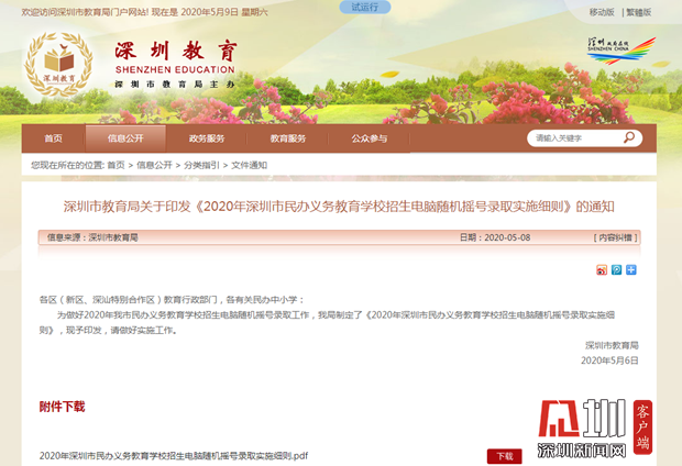 圖為深圳市民辦義務(wù)教育學(xué)校招生電腦隨機(jī)搖號(hào)錄取實(shí)施細(xì)則頁面截圖。