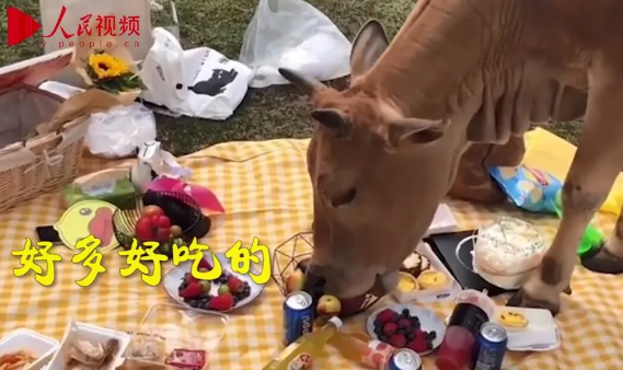 最近福建福清的幾位同學(xué)吭哧吭哧爬了一個(gè)小時(shí)的山,在草地上剛鋪好餐布擺完食物,正準(zhǔn)備拍照時(shí),來了一頭牛……