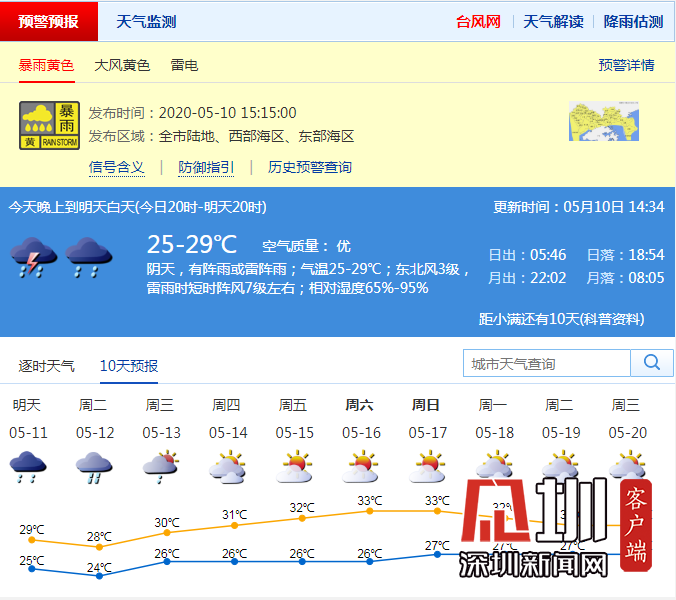 全市進(jìn)入暴雨戒備狀態(tài),請(qǐng)注意防御大風(fēng)和短時(shí)強(qiáng)降水及其引發(fā)的城市積澇、隧道涵洞匯流等。此前,深圳市氣象臺(tái)于2020年05月10日15時(shí)00分在全市發(fā)布雷電預(yù)警,預(yù)計(jì)60分鐘內(nèi)全市自西北向東南將受雷電影響。
