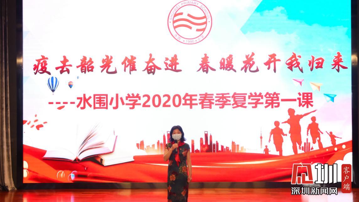 據(jù)悉,水圍小學(xué)“復(fù)學(xué)典禮”上午8:40正式開始,出席的嘉賓有福田區(qū)教科院教研員、少先隊總輔導(dǎo)員李楠、衛(wèi)生健康副校長明昭。各班級的學(xué)生則帶著口罩,單人單桌在教室內(nèi),以觀看直播的方式參加典禮。