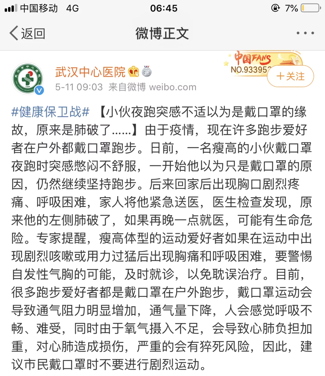 5月11日上午,武漢市中心醫(yī)院官方微博發(fā)布了這樣一個病例,并提醒瘦高體型的運動愛好者如果在運動中出現(xiàn)劇烈咳嗽或用力過猛后出現(xiàn)胸痛和呼吸困難,要警惕自發(fā)性氣胸的可能,及時就診,以免耽誤治療。