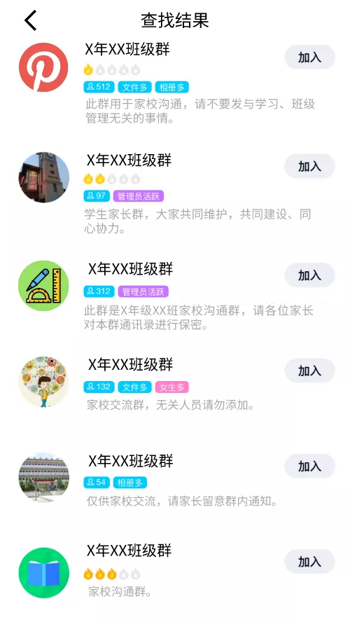 在QQ內(nèi)搜索“班級群”、“年級群”等關鍵字,即可檢索出大量的班級群聊。