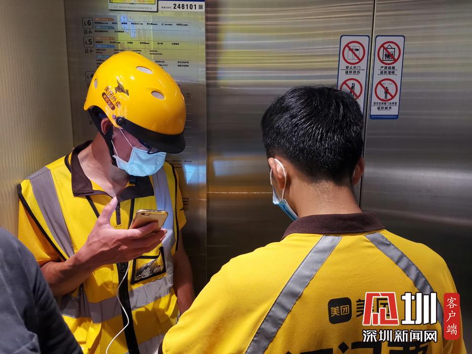 兩位外賣員在電梯里核對(duì)訂單派送信息。