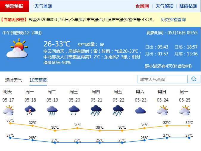 見圳客戶端·深圳新聞網(wǎng)2020年5月16日訊 深圳市氣象臺(tái)預(yù)報(bào),周末天氣悶熱局部有短時(shí)(雷)陣雨下周轉(zhuǎn)趨多降雨天氣:周末期間(16-17日)多云間晴天,天氣悶熱,局部地區(qū)有短時(shí)(雷)陣雨,氣溫27-33℃,中北部最高氣溫可達(dá)35℃左右;下周轉(zhuǎn)趨多降雨天氣,其中18-19日有中到大雨局部暴雨,伴有短時(shí)強(qiáng)降雨、短時(shí)大風(fēng)。