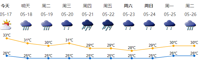 17日白天,粵北市縣、珠三角的部分市縣多云轉雷陣雨,其余市縣多云,局部有(雷)陣雨。
