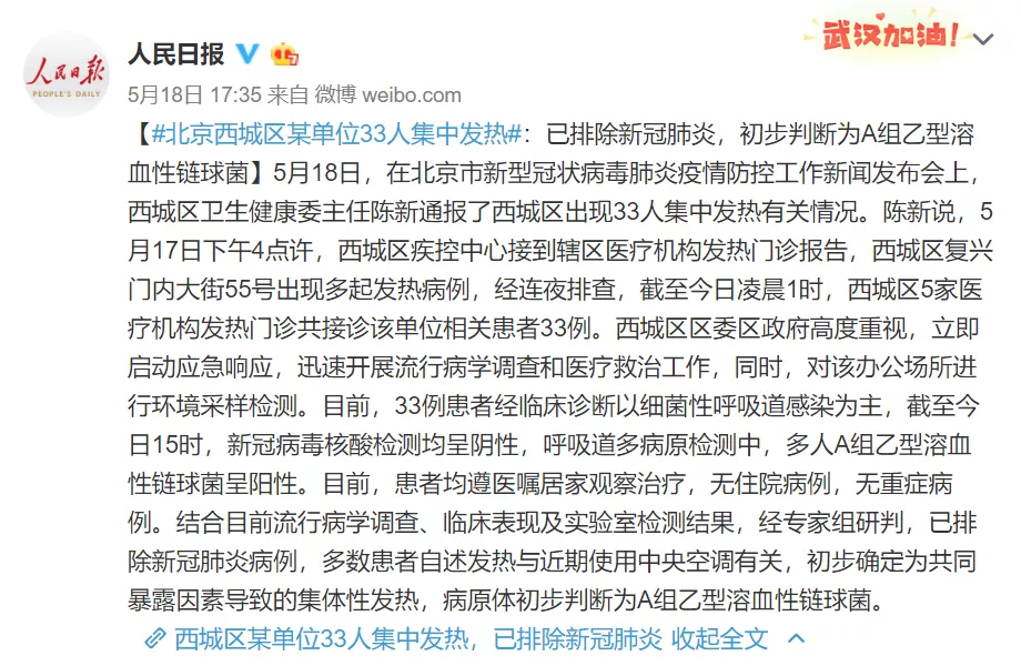 目前,33例患者經(jīng)臨床診斷以細(xì)菌性呼吸道感染為主,截至5月18日15時(shí),新冠病毒核酸檢測均呈陰性,呼吸道多病原檢測中,多人A組乙型溶血性鏈球菌呈陽性。