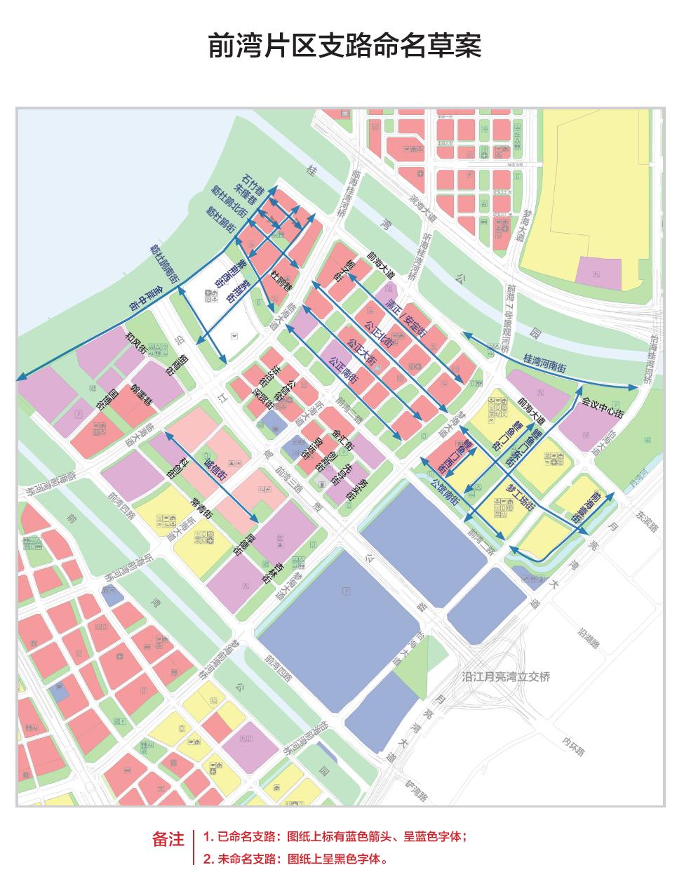 其中,桂灣片區(qū)共約37條(包括已命名支路13條,本次擬定支路命名草案24條),前灣片區(qū)約39條(包括已命名支路20條,本次擬定支路命名草案19條),媽灣片區(qū)共61條(包括已命名支路12條,本次擬定支路命名草案49條)。同時(shí),將代表前海門戶通道的主干道“前灣一路”更名為“前海大道”。