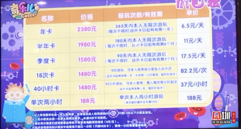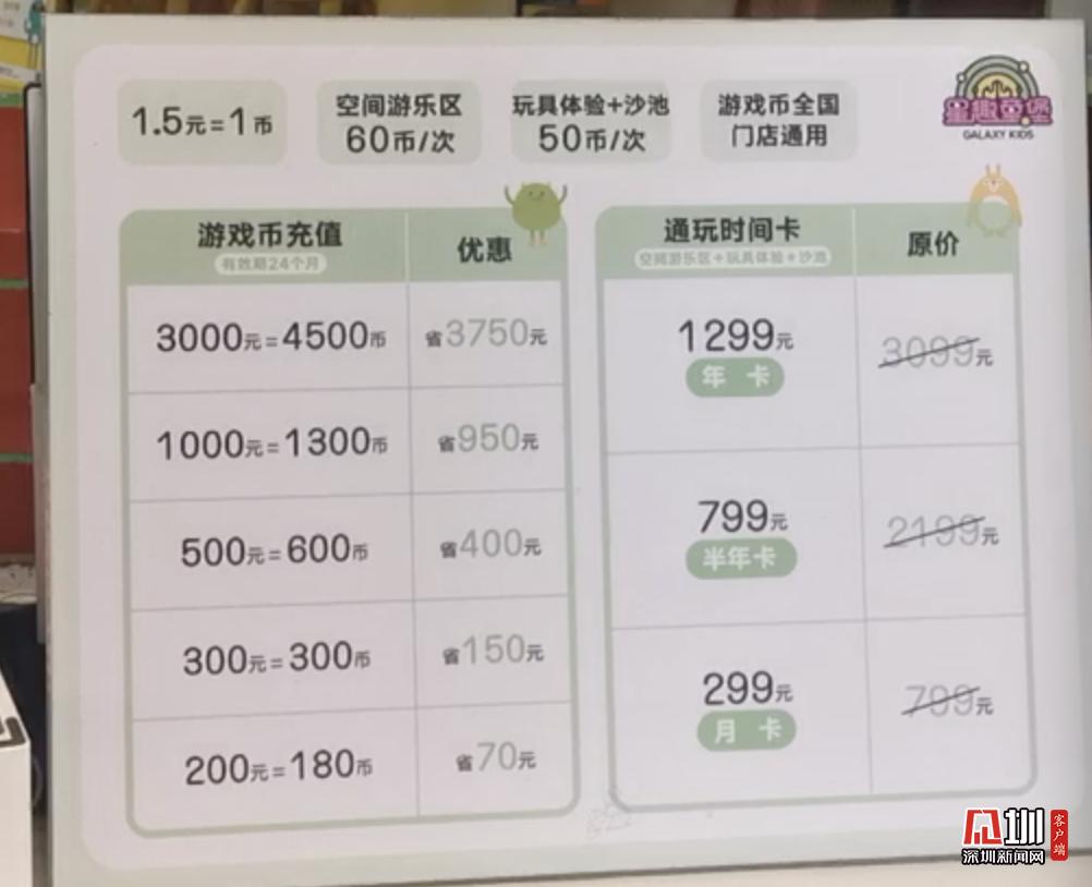 星際傳奇采用多場(chǎng)所差異化的收費(fèi)制度,每個(gè)項(xiàng)目?jī)r(jià)格均有不同,深圳新聞網(wǎng)記者從工作人員處了解到每位兒童的單次消費(fèi)均價(jià)在150元左右,陪同的大人免費(fèi)。有需要的市民也可以選擇辦理月卡或者是年卡,享受更大力度的折扣。游樂場(chǎng)內(nèi)部地面干凈整潔,有家長(zhǎng)休息區(qū),在前臺(tái)有充電寶租借。