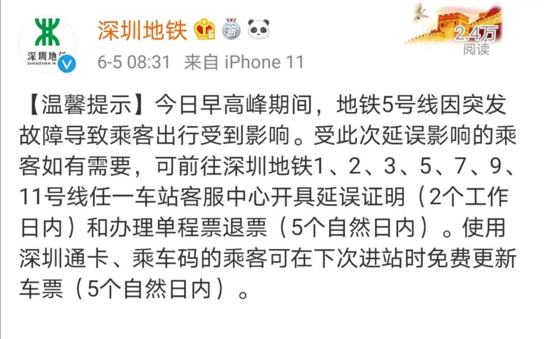 隨后,深圳地鐵官方微博發(fā)布溫馨提示,今日(6月5日)早高峰期間,地鐵5號(hào)線因突發(fā)故障導(dǎo)致乘客出行受到影響。受此次延誤影響的乘客如有需要,可前往深圳地鐵1、2、3、5、7、9、11號(hào)線任一車站客服中心開具延誤證明(2個(gè)工作日內(nèi))和辦理單程票退票(5個(gè)自然日內(nèi))。使用深圳通卡、乘車碼的乘客可在下次進(jìn)站時(shí)免費(fèi)更新車票(5個(gè)自然日內(nèi))。