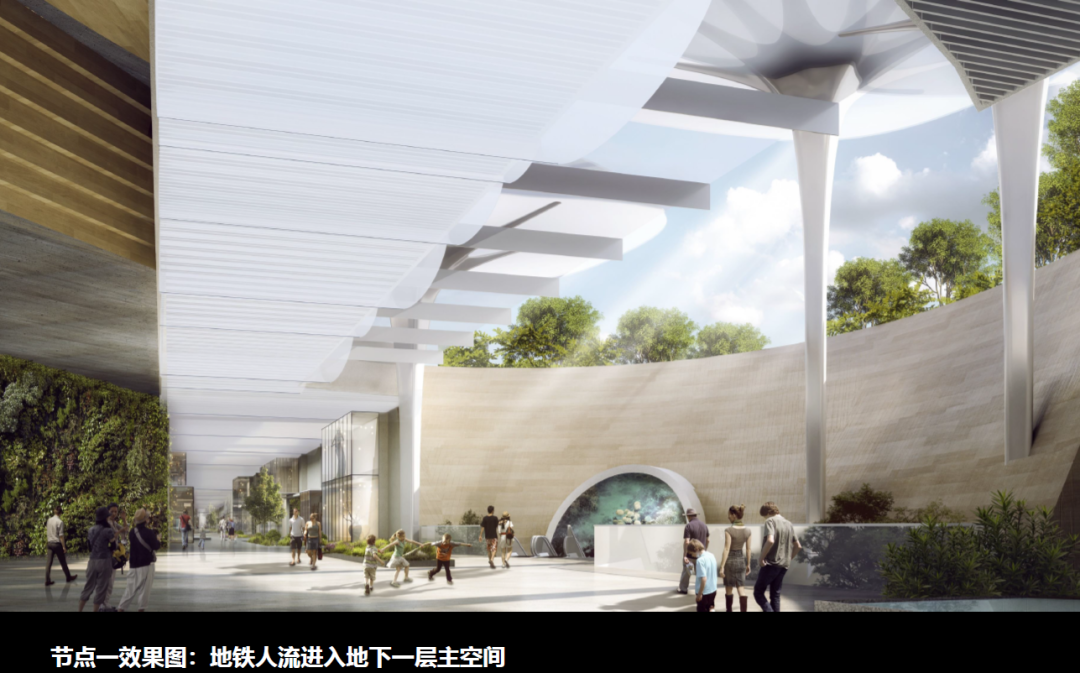 穿過洞穴般的地鐵出口,景象瞬間開闊,陽光透過構(gòu)筑物和煦的灑下,伴著兩側(cè)綠植和藝術(shù)墻緩緩升到負(fù)一層,達(dá)到商業(yè)線性軸和藝術(shù)通道的交匯處。