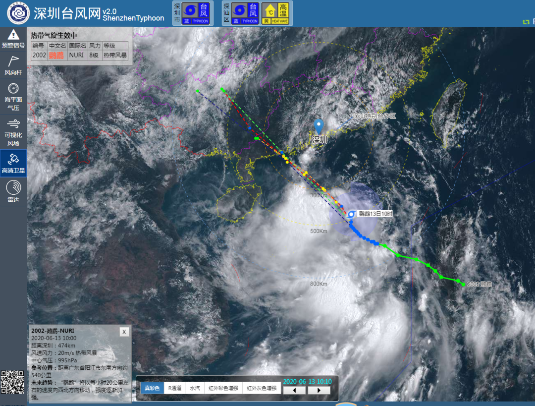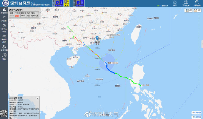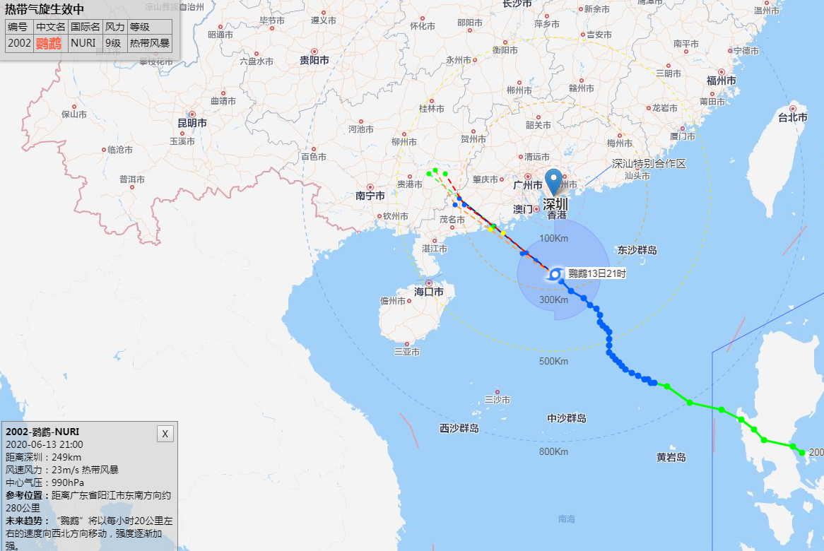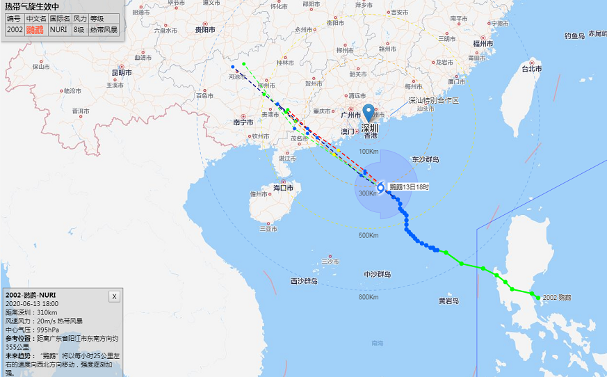 6月13日12時(shí)臺風(fēng)“鸚鵡”(熱帶風(fēng)暴級)位于深圳市東南方大約446公里的海面上,中心附近最大風(fēng)力8級。未來24小時(shí)趨向江門至茂名附近海域,最大可能在陽江附近登陸。我市13日17時(shí)前后起風(fēng)力逐漸加大,13日夜間至14日上午為風(fēng)雨主要影響時(shí)段。目前臺風(fēng)藍(lán)色預(yù)警信號生效中。深圳市氣象臺2020年06月13日12時(shí)35分發(fā)布。