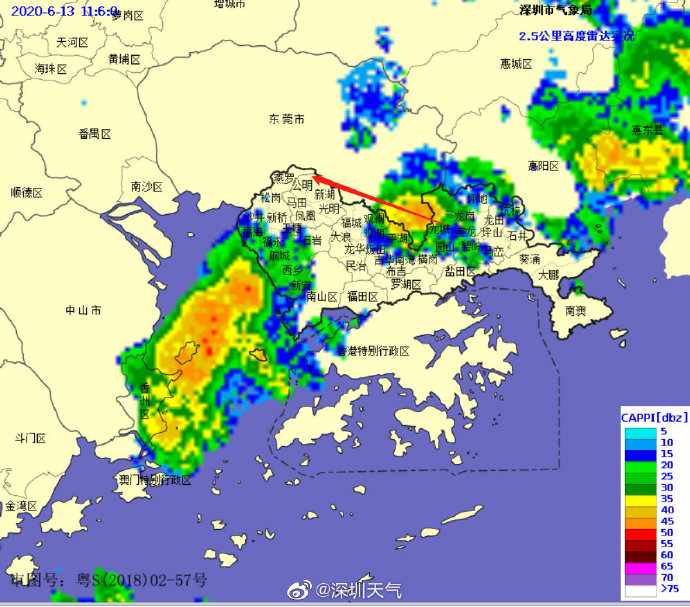 降雨云團(tuán)正在往西北方向移動,預(yù)計(jì)將會影響龍華、光明和寶安北部區(qū)域。