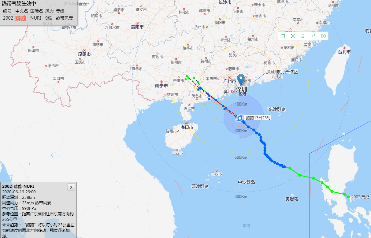 06月14日12時(shí),2002號臺風(fēng)“鸚鵡”(熱帶風(fēng)暴級)的中心位于陽江市陽西縣,中心附近最大風(fēng)力8級,向西北方向移動,強(qiáng)度逐漸減弱,下午將進(jìn)入廣西。截止目前深圳(含深汕)出現(xiàn)中雨局部大雨和6-9級陣風(fēng)。今天午后有間歇性(雷)陣雨,降雨時(shí)伴有6-7級陣風(fēng)。
