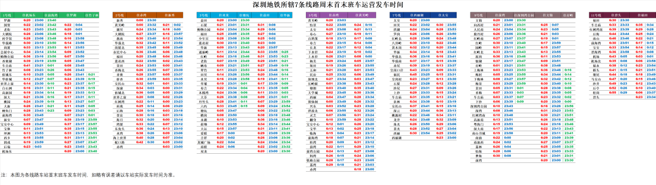 據(jù)介紹,周末期間1號(hào)線羅湖、機(jī)場(chǎng)東首班車時(shí)間提前至6:20,部分中間站的首班車最早提前至6:05左右;半程末班車服務(wù)延長至23:40分,分別從羅湖往前海灣、機(jī)場(chǎng)東往竹子林方向發(fā)車。2號(hào)線往新秀方向部分中間站首班車提前至6:00,往赤灣方向末班車延長至23:30。3號(hào)線部分中間站的首班車提前至6:05左右;半程末班列車服務(wù)保持原有的23:30,分別從益田往塘坑、雙龍往華新發(fā)車。9號(hào)線部分中間站的首班車最早提前至6:05左右;半程末班列車服務(wù)延長至23:30,分別從文錦至深圳灣公園、前灣至孖嶺發(fā)車。
