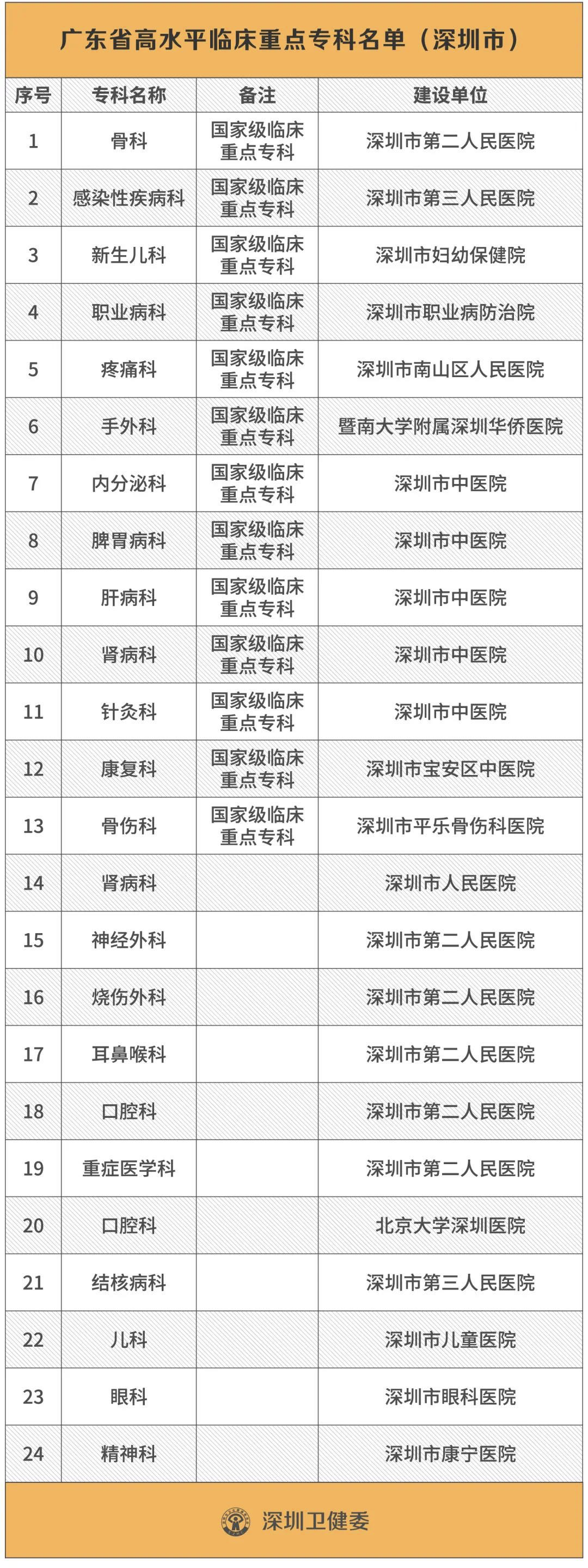 那是因為它們在另一份“省重點”名單上。這就是2019年由廣東省衛(wèi)健委公布的“廣東省高水平臨床重點??啤泵麊?。深圳一共有24個專科入選,其中13個是國家衛(wèi)健委或國家中醫(yī)藥管理局認定的國家級臨床重點??啤?/p>