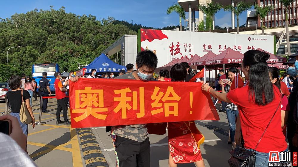【紅嶺中學(xué)】考生學(xué)長來到考點門口為學(xué)弟舉起“奧利給”的旗子。