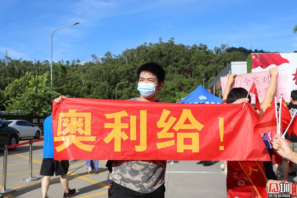 紅嶺中學(xué)考點(diǎn)外,“應(yīng)援團(tuán)”成員為考生們舉起“奧利給”橫幅。