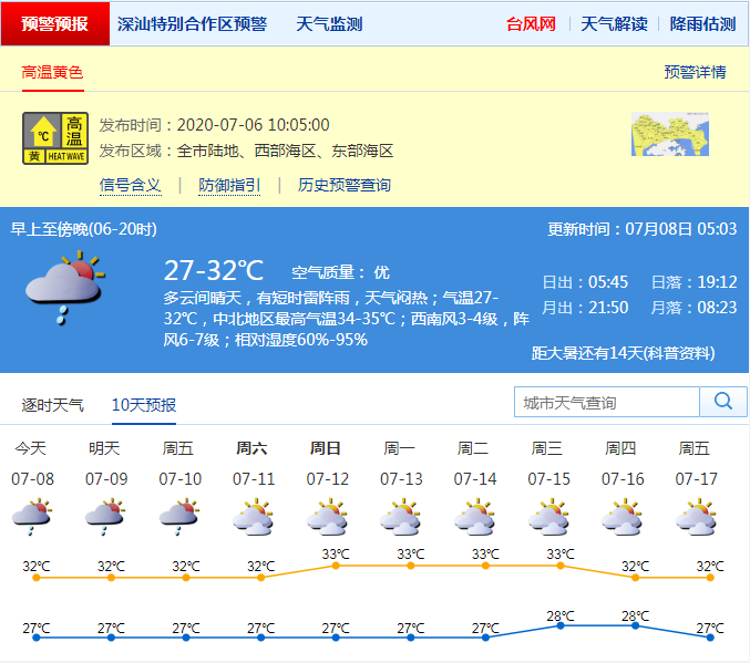 見(jiàn)圳客戶端·深圳新聞網(wǎng)2020年7月8日訊 據(jù)深圳市氣象臺(tái)預(yù)測(cè),深圳今日多云間晴天,有短時(shí)雷陣雨,天氣悶熱;氣溫27-32℃,中北地區(qū)最高氣溫34-35℃;西南風(fēng)3-4級(jí),陣風(fēng)6-7級(jí);相對(duì)濕度60%-95%。