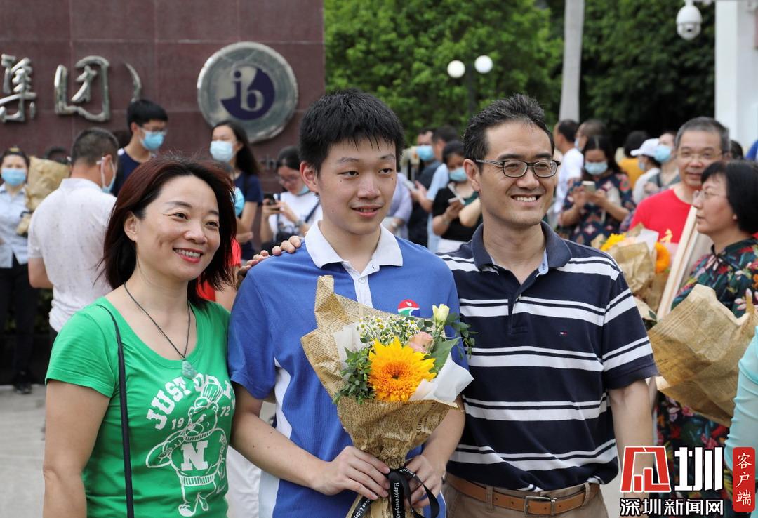 一家三口于深圳高級中學(xué)考點(diǎn)外進(jìn)行合影。