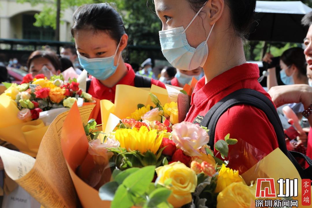 深圳高級中學(xué)考點外舞蹈隊學(xué)妹手捧鮮花,靜候?qū)W姐走出考場。