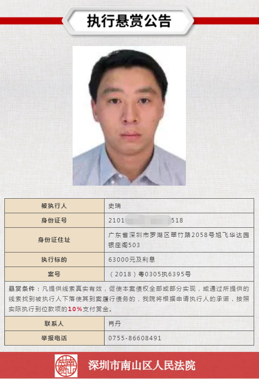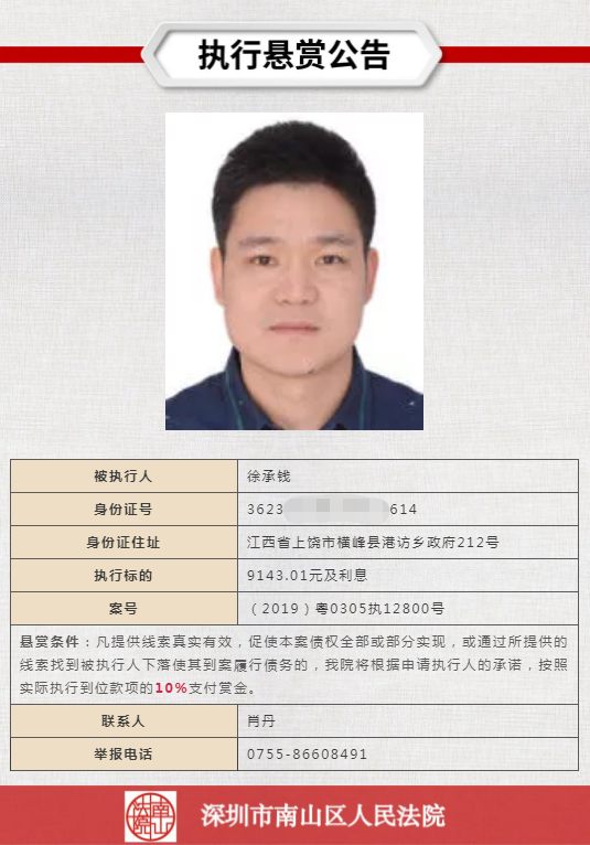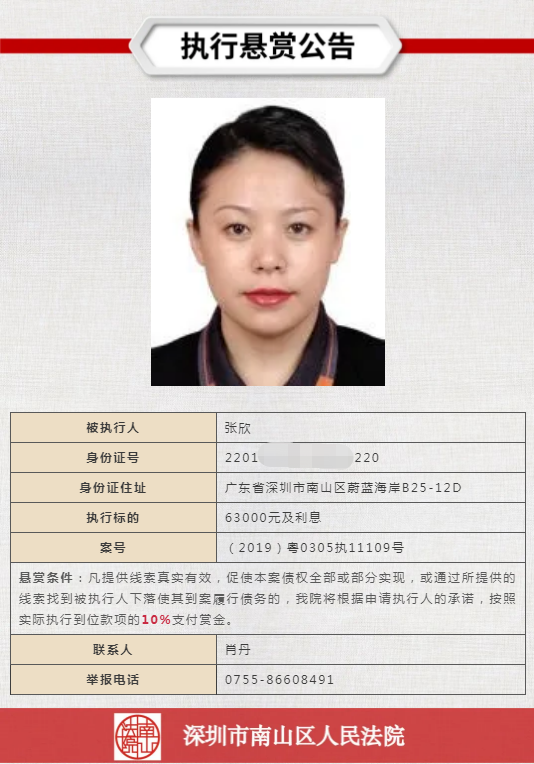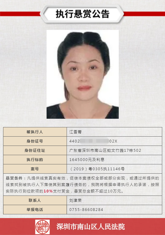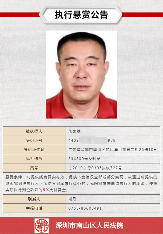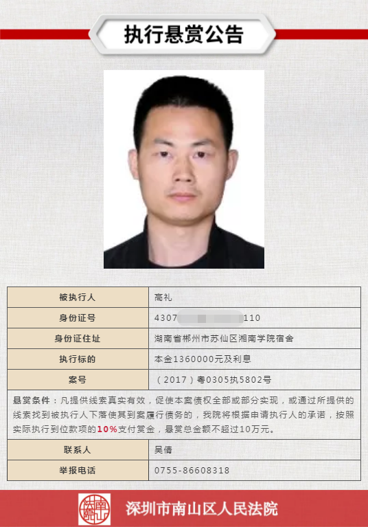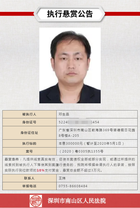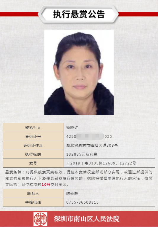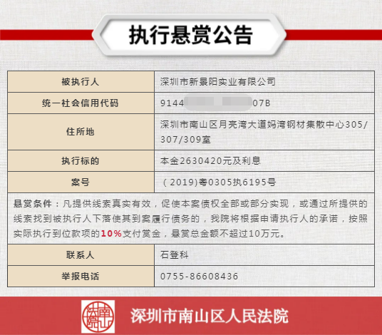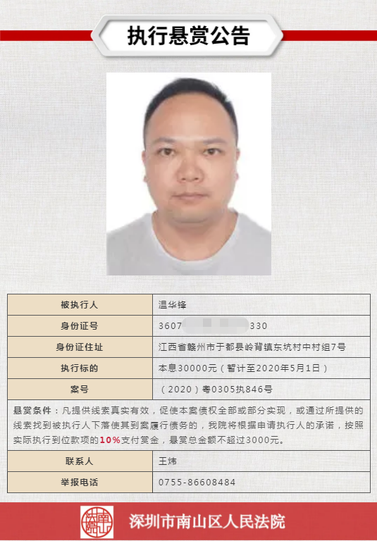 經(jīng)申請執(zhí)行人申請,深圳市南山區(qū)人民法院向社會(huì)發(fā)布懸賞舉報(bào)公告,凡提供線索真實(shí)有效,促使本案債權(quán)全部或部分實(shí)現(xiàn),或通過所提供的線索找到被執(zhí)行人下落使其到案履行債務(wù)的,深圳市南山區(qū)人民法院將根據(jù)申請執(zhí)行人的承諾,按照實(shí)際執(zhí)行到位款項(xiàng)給予一定金額的賞金。