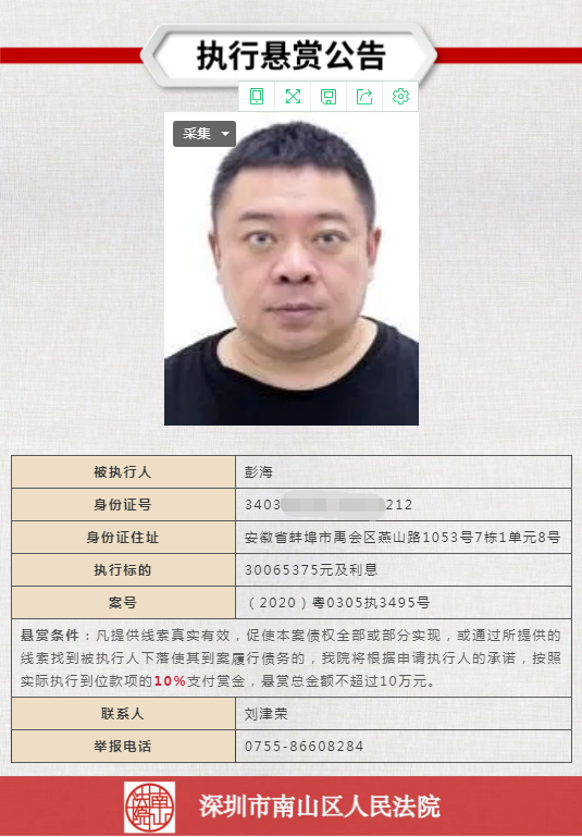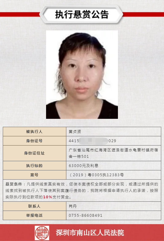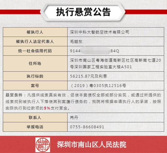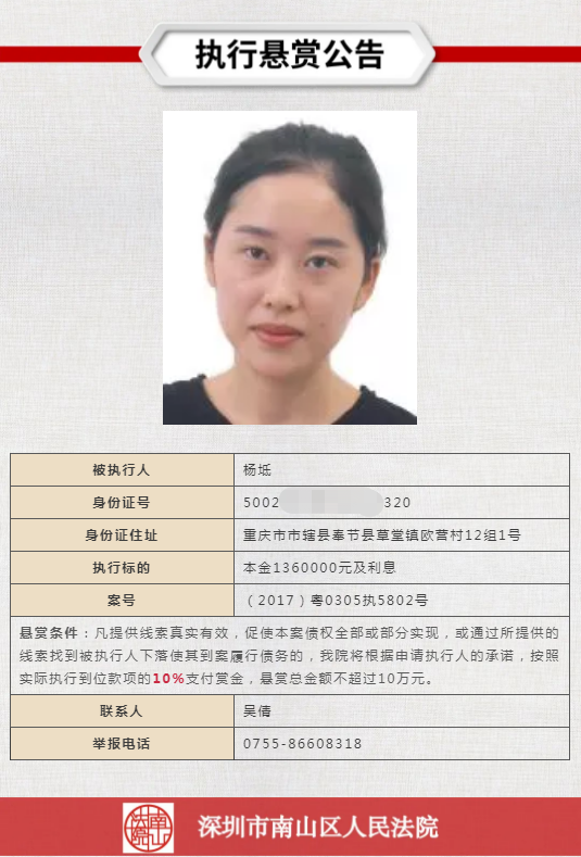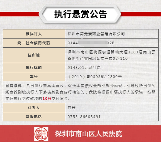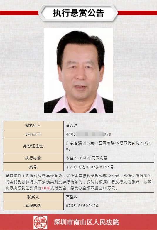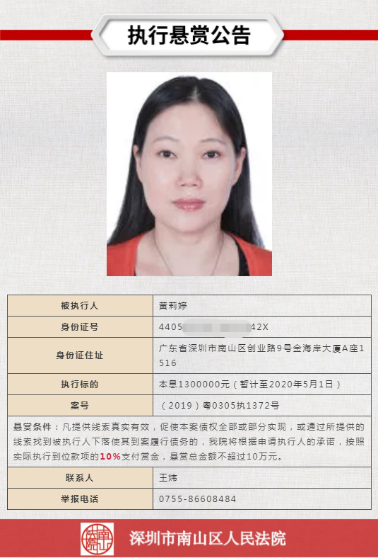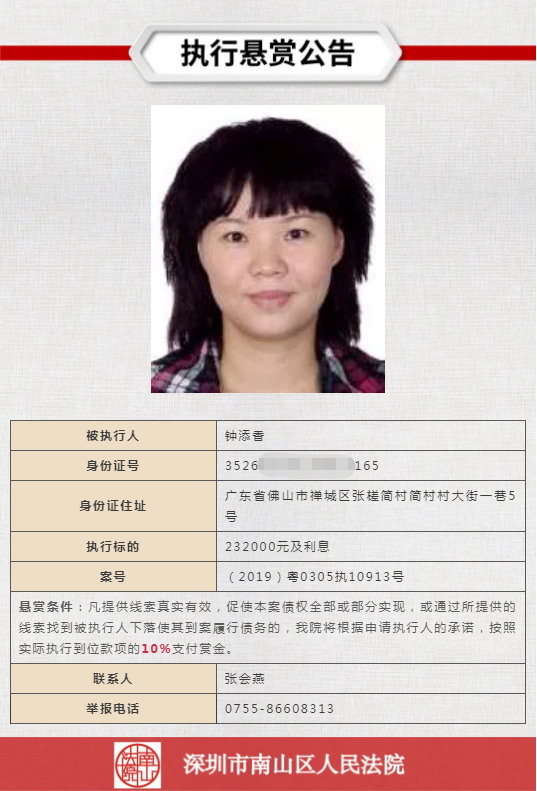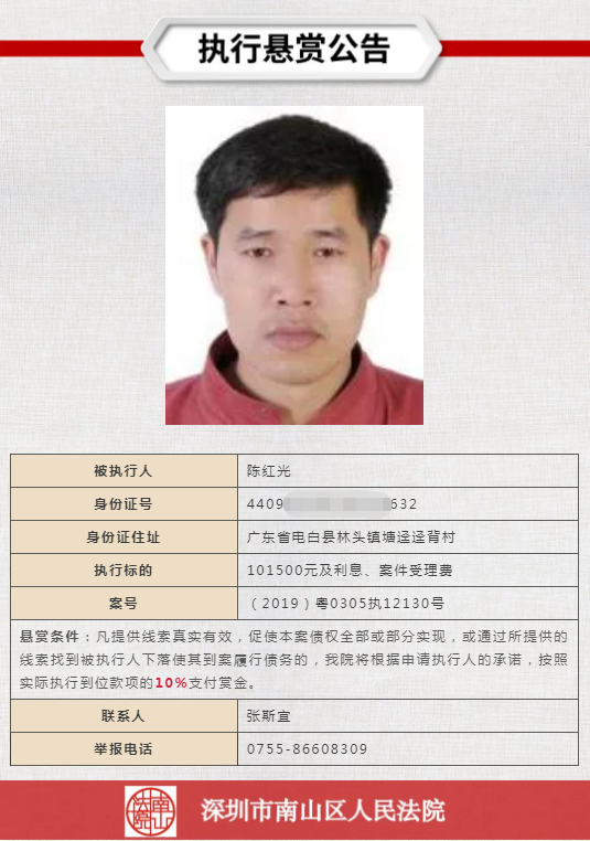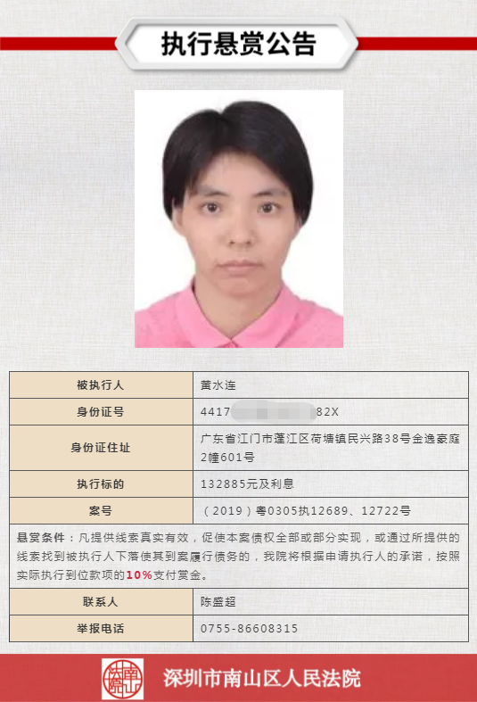 經(jīng)申請執(zhí)行人申請,深圳市南山區(qū)人民法院向社會(huì)發(fā)布懸賞舉報(bào)公告,凡提供線索真實(shí)有效,促使本案債權(quán)全部或部分實(shí)現(xiàn),或通過所提供的線索找到被執(zhí)行人下落使其到案履行債務(wù)的,深圳市南山區(qū)人民法院將根據(jù)申請執(zhí)行人的承諾,按照實(shí)際執(zhí)行到位款項(xiàng)給予一定金額的賞金。