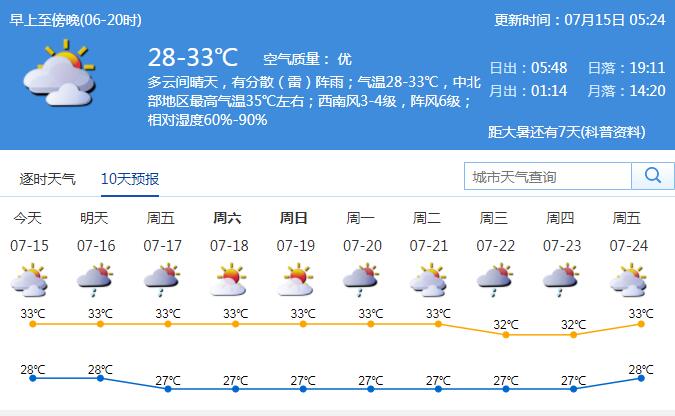 5日多云間晴天,有分散(雷)陣雨;氣溫28-33℃,中北部地區(qū)最高氣溫35℃左右。