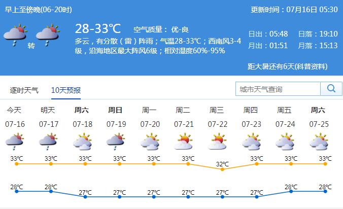 見圳客戶端·深圳新聞網(wǎng)2020年7月16日訊 未來一周天氣持續(xù)悶熱。16日多云間晴天,有分散(雷)陣雨;氣溫28-33℃,中北部地區(qū)最高氣溫35℃左右;西南風(fēng)3-4級(jí),沿海、高地和海區(qū)最大陣風(fēng)6級(jí);相對(duì)濕度55%-90%。17日多云,間中有分散(雷)陣雨;18-22日晴天間多云,局地偶有(雷)陣雨。