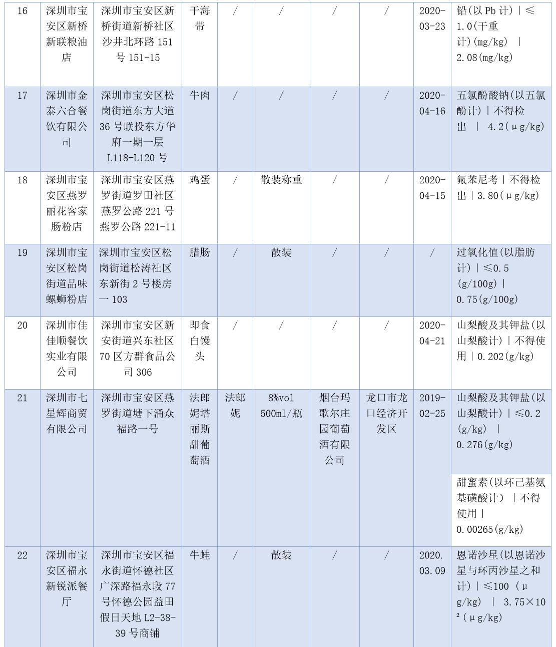 見圳客戶端·深圳新聞網(wǎng)2020年7月17日訊(晶報(bào)記者 鄧裴裴/制圖)7月17日,深圳市市場(chǎng)監(jiān)督管理局官網(wǎng)發(fā)布了2020年第二十二期食品安全抽樣檢驗(yàn)情況通報(bào),3-5月,共抽檢生產(chǎn)、流通、餐飲環(huán)節(jié)食品1229批次,發(fā)現(xiàn)不合格樣品47批次。記者注意到,不少不合格樣品抽檢單位為餐飲店,包括皇軒酒店、窯雞王、愛上牛蛙、御可奶茶等,還有些小吃店、腸粉店、螺獅粉店紛紛上榜。涉及不合格項(xiàng)目類別包括農(nóng)藥殘留、獸藥殘留、食品添加劑、微生物污染、品質(zhì)指標(biāo)、金屬等元素污染物。