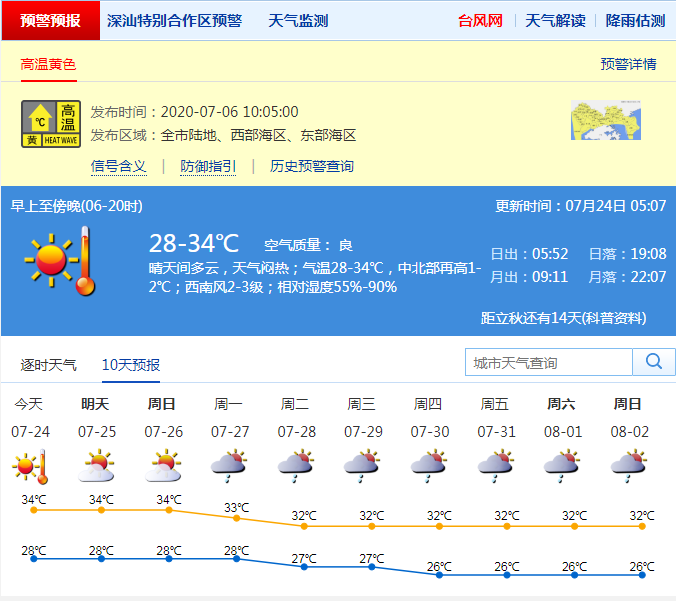 見圳客戶端·深圳新聞網(wǎng)2020年7月24日訊(見圳客戶端、深圳新聞網(wǎng)記者 陳婕 鄭曉鵬)老天熱“晴”不斷,今明兩天悶熱加劇。24日晴天間多云,天氣悶熱;氣溫28-34℃,中北部再高1-2℃;偏南風(fēng)3級;濕度55%-90%。25日晴天間多云,最高氣溫34-35℃,中北部可達36-37℃。26日持續(xù)晴熱,局地有短時(雷)陣雨;27-29日多云,有短時(雷)陣雨;30日有陣雨或雷陣雨。