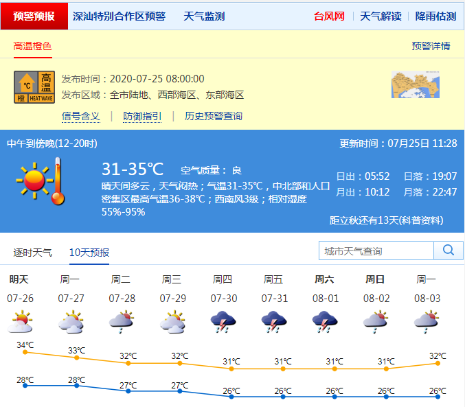 深圳市氣象局預(yù)計(jì)今明兩日深圳(含深汕)高溫天氣持續(xù),最高氣溫可達(dá)34-36℃;27-31日轉(zhuǎn)雷雨天氣,高溫天氣略有緩解,其中27-28日多云,有短時(雷)陣雨;29-31日有雷陣雨。