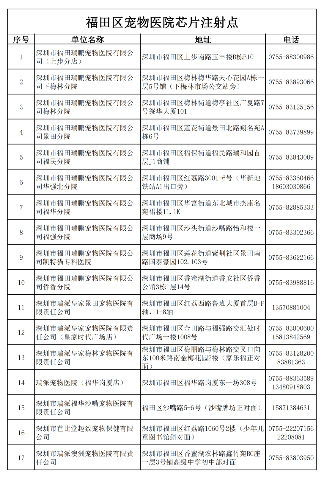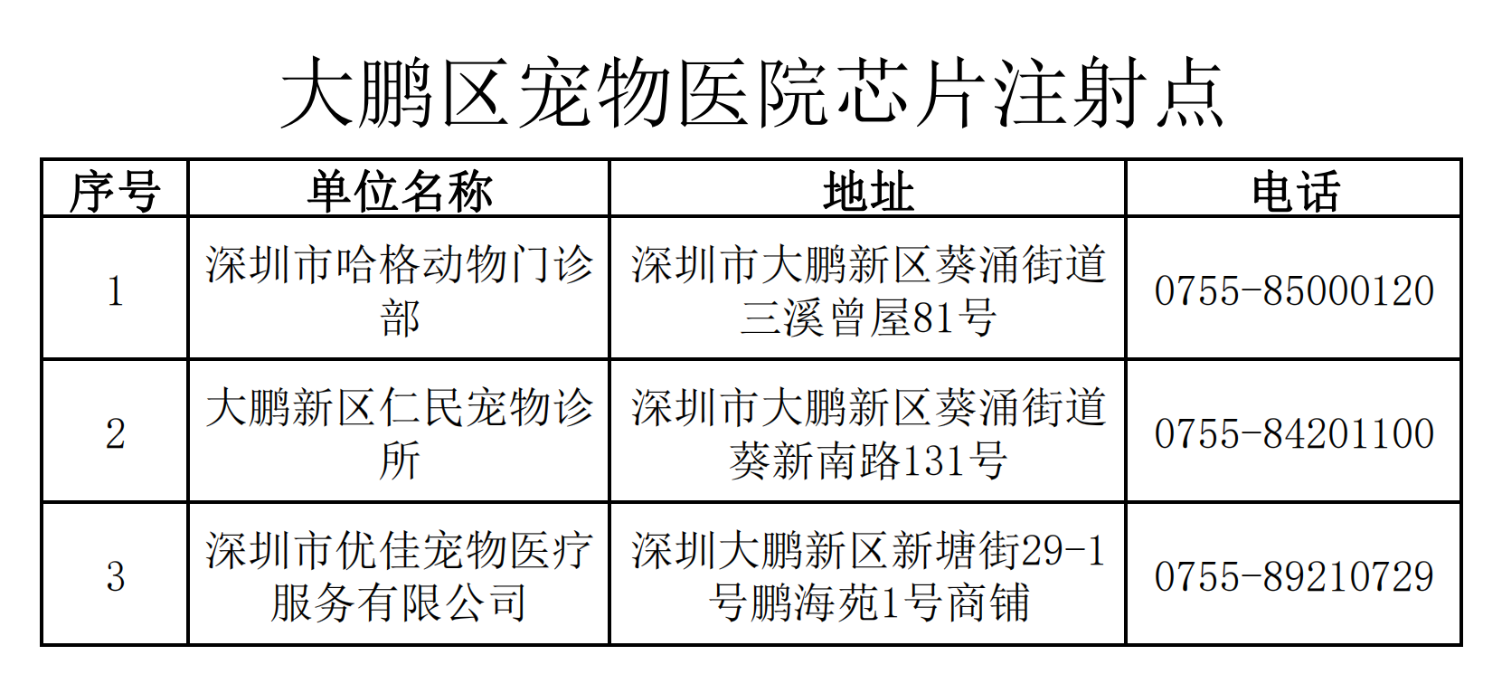 據(jù)福田區(qū)城市管理和綜合執(zhí)法局市容管理科副科長羅偉介紹,犬只芯片植入工作目前已在深圳市福田瑞鵬寵物醫(yī)院梅林分院、瑞派皇家寵物醫(yī)院時代廣場店完成試點,隨后將在全區(qū)33個寵物醫(yī)院陸續(xù)開放芯片植入工作。