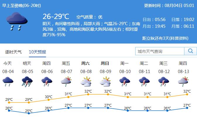 見圳客戶端·深圳新聞網(wǎng)2020年8月4日訊 今年第3號臺風(fēng)“森拉克”(熱帶風(fēng)暴級)已于8月2日14時40分前后在越南清化市登陸,并逐漸減弱消失。第4號臺風(fēng)“黑格比”(熱帶風(fēng)暴級)趨向華東沿海。據(jù)市氣象臺消息,4日有間歇性陣雨,局部大雨到暴雨,氣溫25-29℃;4日夜間起雨勢加強(qiáng),5日有暴雨局部大暴雨,陣風(fēng)6-7級;6日白天起降水逐漸減弱,7-9日漸趨悶熱。