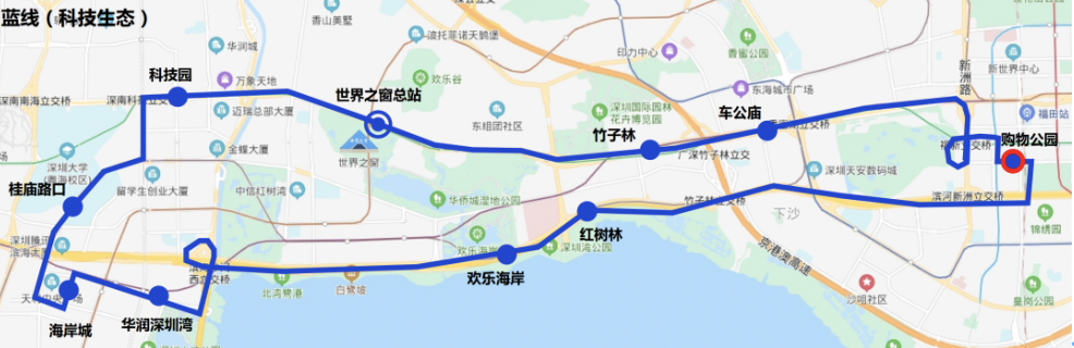 ??空军c(diǎn):世界之窗總站→竹子林→車公廟→購物公園→紅樹林→歡樂海岸→華潤深圳灣→海岸城→深大-騰訊站→科技園→世界之窗總站