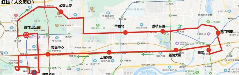 停靠站點(diǎn):蓮花山公交總站→公交大廈→華強(qiáng)北→荔枝公園→東門老街→國貿(mào)→新聞大廈→上海賓館→市民中心→購物公園地鐵站→蓮花山公園→蓮花山公交總站