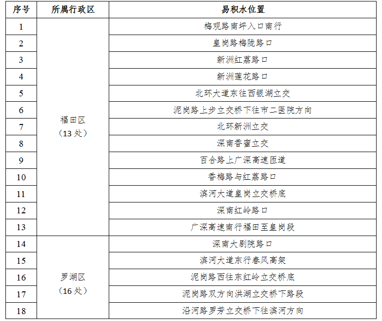 根據(jù)深圳市氣象局等權威部門發(fā)布的易積水路段匯總信息,深圳全市范圍暴雨天氣易積水路段如下,其中,東環(huán)一路、新洲路、文錦北路等路段周邊積水相對密集,請市民朋友小心留意,注意安全。