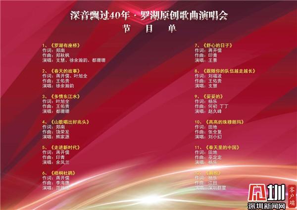 歌曲創(chuàng)作是深圳市羅湖區(qū)的強(qiáng)項(xiàng),中國大陸的流行歌曲即由此發(fā)端。四十年來,《春天的故事》、《走進(jìn)新時代》、《跟隨你的隊(duì)伍越走越長》、《山歌唱出好兆頭》等一大批膾炙人口的羅湖原創(chuàng)歌曲,經(jīng)由影視、廣播等媒體傳播,風(fēng)靡大江南北,反映了時代劇變,表達(dá)了人民心聲。此次演唱會,精選了其中的12首歌曲,由熊家源、余鳳蘭、劉小幻、范媛媛、楊樂、支慧、趙久峰、都園園、王景、徐余瀚韻等數(shù)位深圳歌唱家傾情演繹,其中既有創(chuàng)作于上世紀(jì)的歌曲,也有近年來新創(chuàng)作的歌曲,堪稱一場聲樂盛宴。