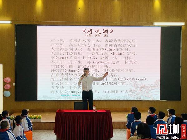 深圳新聞網(wǎng)訊(深圳新聞網(wǎng)記者 彭桂紅 通訊員 梁文雅)為進(jìn)一步弘揚(yáng)中華優(yōu)秀傳統(tǒng)文化,近日,深圳市錦田小學(xué)特邀青年文化學(xué)者、深圳市百姓學(xué)習(xí)之星、深圳市公益閱讀推廣人、深圳市首屆家園文化文學(xué)會會長晉玉東為廣大師生開展了一場別開生面的“中國古典詩詞朗誦藝術(shù)鑒賞——兼談如何朗誦好一首詩”公益文化講座。羅湖區(qū)錦田小學(xué)德弘校區(qū)副校長劉向陽、羅湖區(qū)錦田小學(xué)德弘校區(qū)主任張俊暉、羅湖區(qū)未來學(xué)校主任謝淑紅、德弘二年級家委代表以及語文科組老師,一同參加。活動由班主任梁文雅和學(xué)生劉沛東、張家琪共同主持,近200名學(xué)生參加了講座活動。整場講座師生熱情高漲,主講嘉賓深入淺出、娓娓道來,參與學(xué)生思維活躍、表現(xiàn)積極,帶動校園形成了學(xué)習(xí)詩詞文化的良好氛圍。