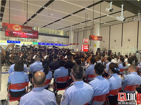 作為慶祝中國共產黨成立100周年專題節(jié)目、蓮塘邊檢站黨史教育學習專題活動,音樂會在莊嚴神圣的升旗儀式中拉開序幕,深圳交響樂團的68名資深演奏人員在嶄新的出入境邊防檢查通道前,奏響了一首首紅色經典旋律,與現代化的口岸邊防檢查設施交相輝映,激蕩回響、動人心魄,體現蓮塘邊檢站全體民警對黨忠誠、服務人民、執(zhí)法公正、紀律嚴明的赤膽忠誠。音樂會在《沒有共產黨就沒有新中國》雄壯的齊唱聲中結束。