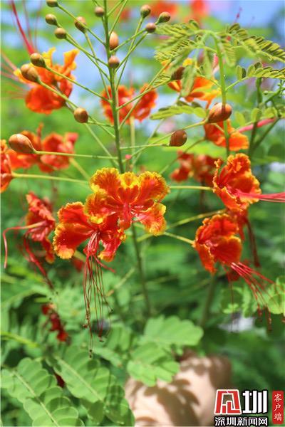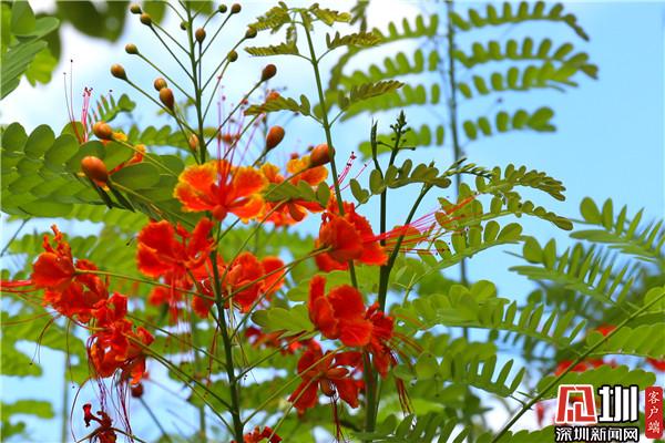 五月綻放全城的鳳凰花,映射著深圳這座城市的繁華與熱情,同時(shí)也給這座城市帶來(lái)勇敢熱烈的色彩。從鏡頭中可見(jiàn),鳳凰花花團(tuán)緊簇,在藍(lán)天的襯托下,那一簇簇火紅的花海張揚(yáng)而又高調(diào)地綻放,為深圳“藍(lán)”染上了一抹紅。