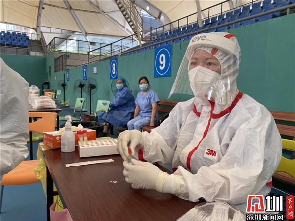 為提高轄區(qū)核酸檢測(cè)效率,羅湖區(qū)在羅湖區(qū)體育館搭建了臨時(shí)檢測(cè)點(diǎn),主要為轄區(qū)農(nóng)貿(mào)市場(chǎng)、商超、KTV等重點(diǎn)行業(yè)從業(yè)人群進(jìn)行核酸檢測(cè)。5月30日上午,記者來到羅湖區(qū)體育館網(wǎng)球館,只見一排的采樣作業(yè)臺(tái)有序排開,一米之外,是秩序井然的排隊(duì)人員。一張小小的采樣臺(tái),搭配兩名醫(yī)護(hù)人員,他們身穿防護(hù)服、頭戴防護(hù)罩,一名取集樣本、一名放置樣本,一個(gè)采樣流程下來不到兩分鐘,現(xiàn)場(chǎng)井然有序。烈日下,他們的汗水沿著防護(hù)罩流下來,厚重的防護(hù)服下,支撐他們的是堅(jiān)守一線的責(zé)任感和使命感。