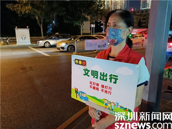 另一位堅守在國慶假期里的義工是宣仲英,今年62歲。她一站兩個小時,始終是精神抖擻,毫不松懈??吹接腥嗽噲D闖紅燈,她及時制止??吹接腥瞬蛔甙唏R線,她立刻提醒。她手持勸導(dǎo)文明出行的牌子,就像個交通警察,誰也別想在她的面前犯規(guī)。本來下午6點鐘,正是她給家人做晚餐,同家人一起吃飯的時間,但她聽說社區(qū)創(chuàng)文需要人,就跟家人商量,得到了家人的一致同意。她說,“我從內(nèi)地來到深圳,在老圍社區(qū)住了10年,感覺深圳做義工的氛圍特別濃厚,我也想做義工,為社會發(fā)揮余熱?!?/span>
