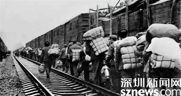 1979年基建工程兵的第一批先遣部隊抵達(dá)深圳,下火車時的情景。攝影/周順斌