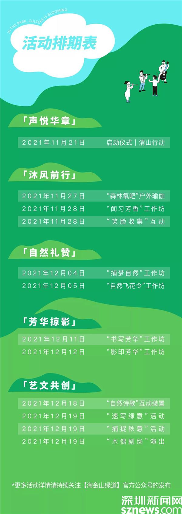 據(jù)悉,自11月27日起連續(xù)四個周末,深圳公園文化季羅湖分會場將帶來一系列健康療愈、藝術(shù)文化、傳統(tǒng)文化等戶外活動,市民可以通過關(guān)注“淘金山綠道”公眾號了解更多活動詳情,報(bào)名參加。