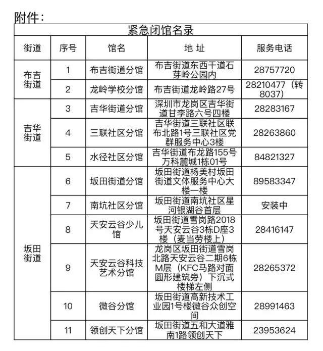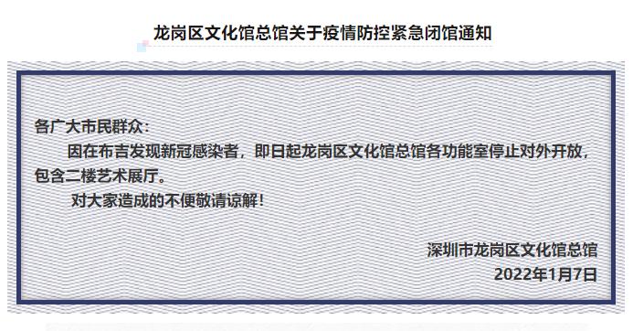 1月7日,深圳市龍崗區(qū)圖書館發(fā)布通知稱,因疫情防控工作需要,為保障市民讀者健康安全,經研究決定,區(qū)圖書館在布吉、坂田和吉華三個街道的所有分館,自2022年1月7日起臨時閉館,暫停到館讀者服務和各項活動,進行衛(wèi)生消殺、內務整理等,恢復開館時間另行通知。