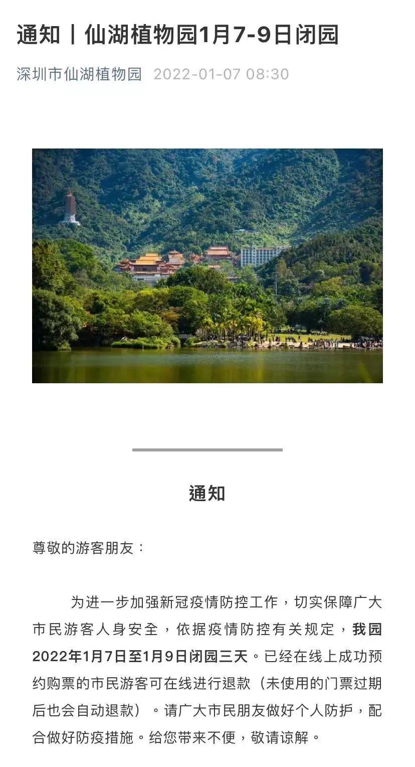據深圳市仙湖植物園官方微信號1月7日8點30分發(fā)布的通知, 為進一步加強新冠疫情防控工作,切實保障廣大市民游客人身安全,該園1月7日至1月9日閉園3天。已經在線上成功預約購票的市民游客可在線進行退款(未使用的門票過期后也會自動退款)。